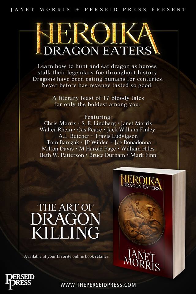 HEROIKA 1 — DRAGON EATERS, an anthology of heroic fiction edited by Janet Morris, features original stories by Janet Morris and Chris Morris, S. E. Lindberg, Jack William Finley, Travis Ludvigson, Tom Barczak, J. P. Wilder, Joe Bonadonna, Milton Davis, Alexandra Butcher, William Hiles, M Harold Page, Walter Rhein, Cas Peace, Beth Waggoner Patterson, Bruce Durham, Mark Finn.