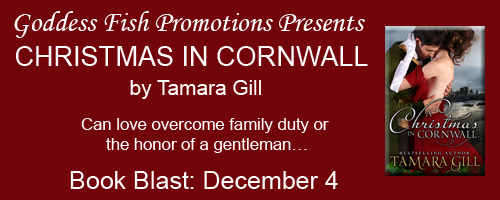 Goddess Fish Promotions is organizing a Virtual Book Blast Tour for A CHRISTMAS IN CORNWALL by Tamara Gill, a Regency Holiday Romance available December 4. The Book Blast Tour will take place on Friday, December 4. This tour will not include interviews or guest blogs; however, a blurb, excerpt and author bio will be provided to every host for inclusion on their blog. No reviews are being requested for this tour.