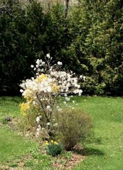 | Too optimistic for our location, in March we yearned to celebrate an official changing of the guard. Winter seemed ready to retreat, but recalcitrant spring flew in, shifted uneasily from foot to foot. then fled snowdrops shivering after a bitter Easter, leaving us powerless in April’s ice-storms, Two weeks later, she returns Birds nest and sing in triumph, fish swim the creek, rabbits run through gardens, suddenly blue, yellow white and red. Longed for flowers bloom all at once— scilla, hyacinth, tulips, daffodils, forsythia, anemones, even magnolia! A bounty almost insulting, as though Spring is thumbing her nose at us. But today the trees… |